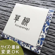 13. 【凸型・浮き出し文字 陶器表札】 椿魚書体の味わいと黒土に呉須紺色の小紋柄(こもんがら)。 黒小紋 J51 サイズ:約195×220×7mm