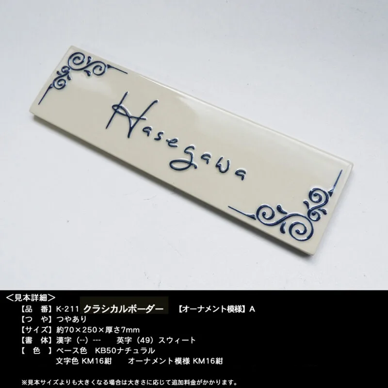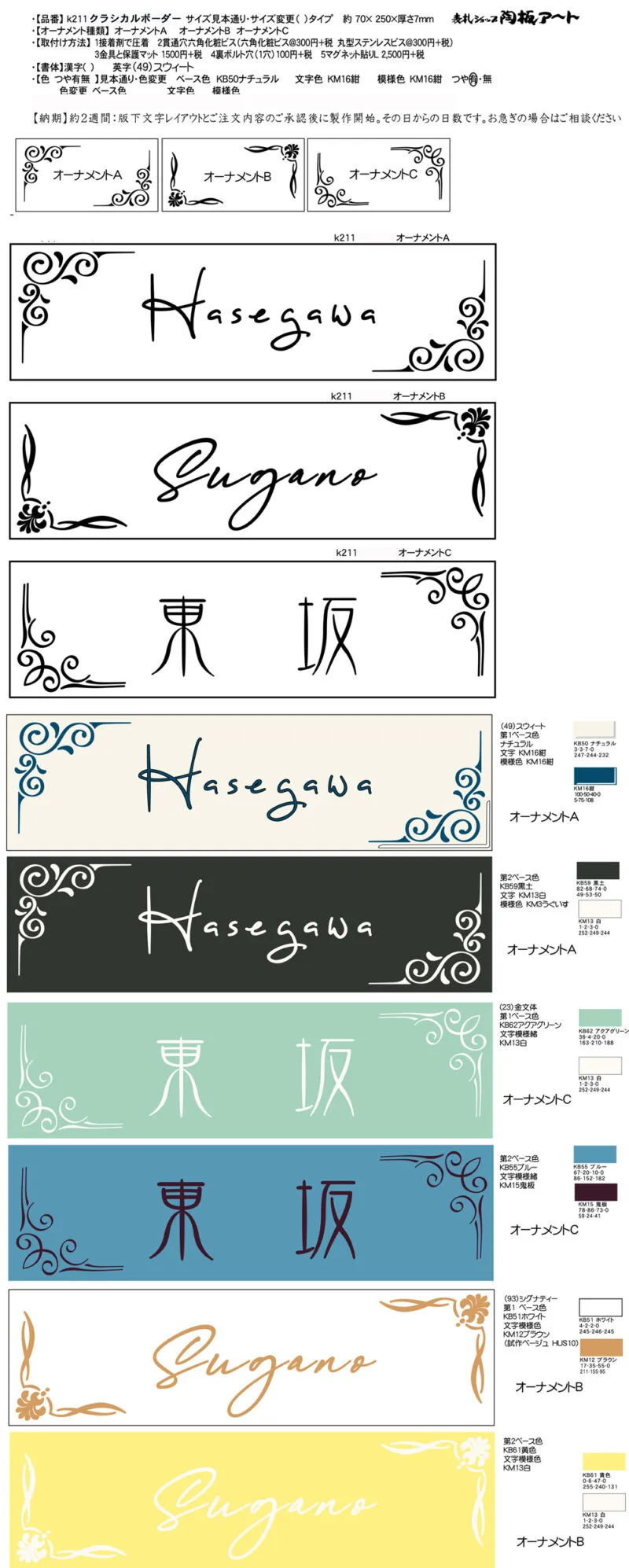 | ・【品番】 k211クラシカルボーダー サイズ 約 70× 250×厚さ7mm ・【納期】約2週間:版下文字レイアウトとご注文内容のご承認後に製作開始。その日からの日数です。お急ぎの場合はご相談ください。 ・【オーナメント種類】 オーナメントA オーナメントB オーナメントC から選んでください ・【取付け方法】 1接着剤で圧着 2貫通穴六角化粧ビス(六角化粧ビス@300円+税 丸型ステンレスビス@300円+税) 3金具と保護マット 1500円+税 4裏ボルト穴(1穴)100円+税 5マグネット貼りL 2,500円+税 ・【書体】漢字( ) 英字(49)スウィート ・【色 つや有無 】見本通り・色変更 ベース色 KB50ナチュラル 文字色 KM16紺 模様色 KM16紺 つや有・無 ・【価格】つやなし本体価格16,000円+消費税 つやあり本体価格17,000円+消費税 |